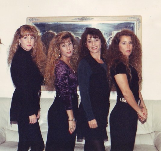 Here they are, four daughters in a row. Can you pick out the twins? I can.  When the twins were babies I could be blindfolded and tell them apart just by their smell. I was very animalistic then about my babies. I still am. Better be careful. I bite.
