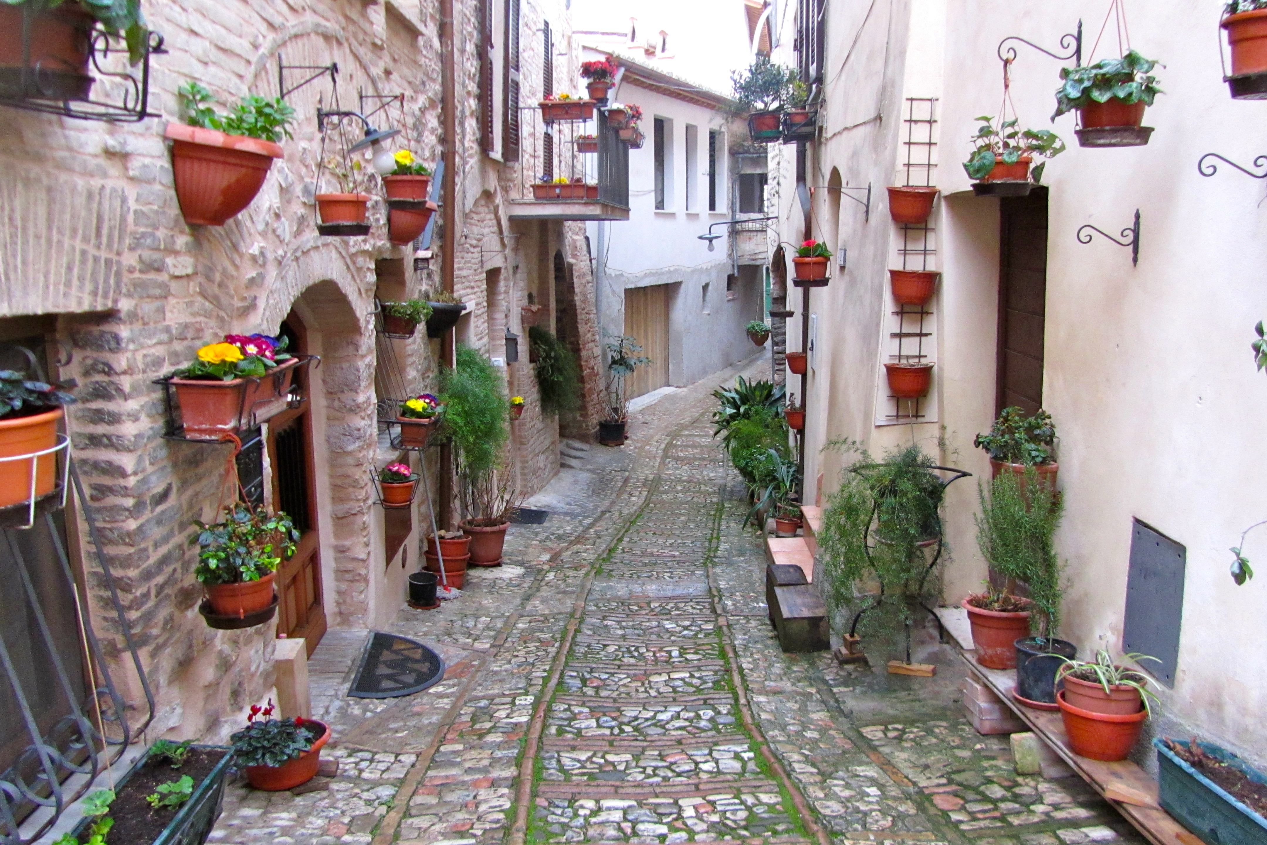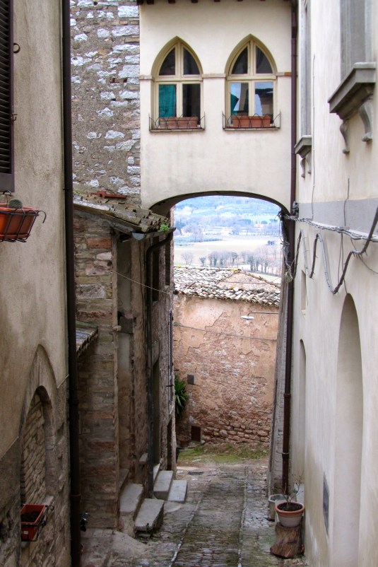 This morning quite early we boarded train 9824 in Roma and ended up in Foligno, Umbria. We lugged our bags up gigantic stairs and came out to a line of Taxi’s.We were driven up, up, up, to the the Medevil town  of Spello. Spello hugs the hillside and the hills are the whole town.  Skip and I walked up to the top winding through lanes with cars making you splay your body up against the building lest you get smashed by a speeding oncoming car. My idea of a quaint little town is Spello minus the cars. One has to realize that cars are the 21st century and Spello once ancient and still maintains ancient buildings is now part of the 21st century. Our first walk took us to the top where we overlooked the beautiful countryside. I would like to enclose some photos of the beautiful recesses viewed on our walk. I dropped my jaws around each bend with the new view.