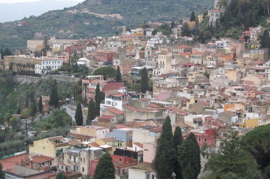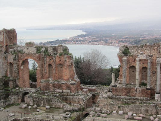 Our afternoon tour was to Taormina, a beautiful sea side village on the Ionian Sea. Not only is the whole town beautiful, the main street charming, but it has a unique place of great interest which is the ruins of a Greek Theater. It is one of the most famous Sicilian monuments in the country. It was an honor to be taken there and spend time in this spot. They still use this theater in the summer when evenings are warm and they invite top performing artists to perform. It is capable of seating 5,000 spectators. It is my favorite ruin and monument to date.