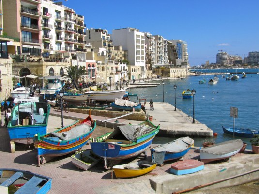 Spinola Bay, Malta is part of St. Julian’s and is a lovely spot for a walk down by the water’s edge. There are some interesting apartment-style developments, as well as some traditional Maltese houses along its quayside. What I found in this bay as a most special treasure are the traditional boats of the Maltese fishermen with exquisite bright colors and beautiful craftsmanship. I think often about the images I photographed that day on the bay. I want you to enjoy some of the photos because they glow in my brain and I keep thinking how lucky I was to spend an afternoon at Spinola Bay on a bright, sunny winter’s day.