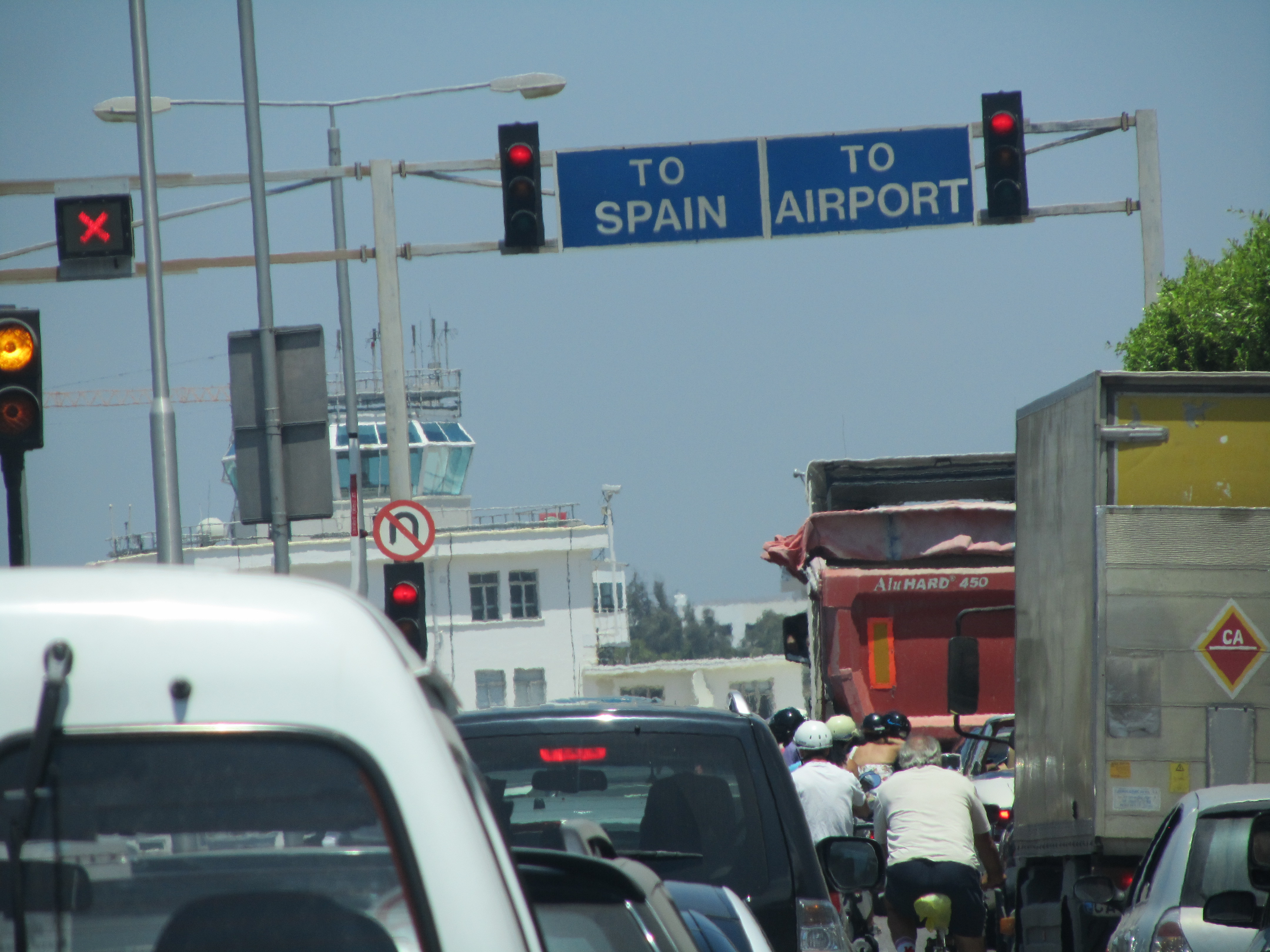 We had to wait at the light going into Gibraltar and going out as well. Planes used the main road as an airport runway and when a plane is going to be taking off or landing, you have to stop and wait until the red lights turn green. This can happen quite a number of times a day. Everyone is patient.