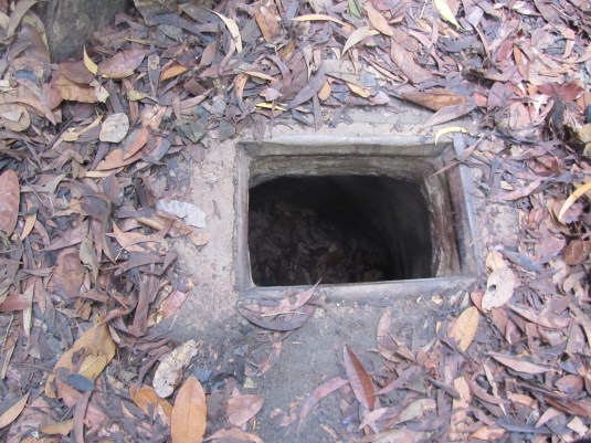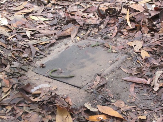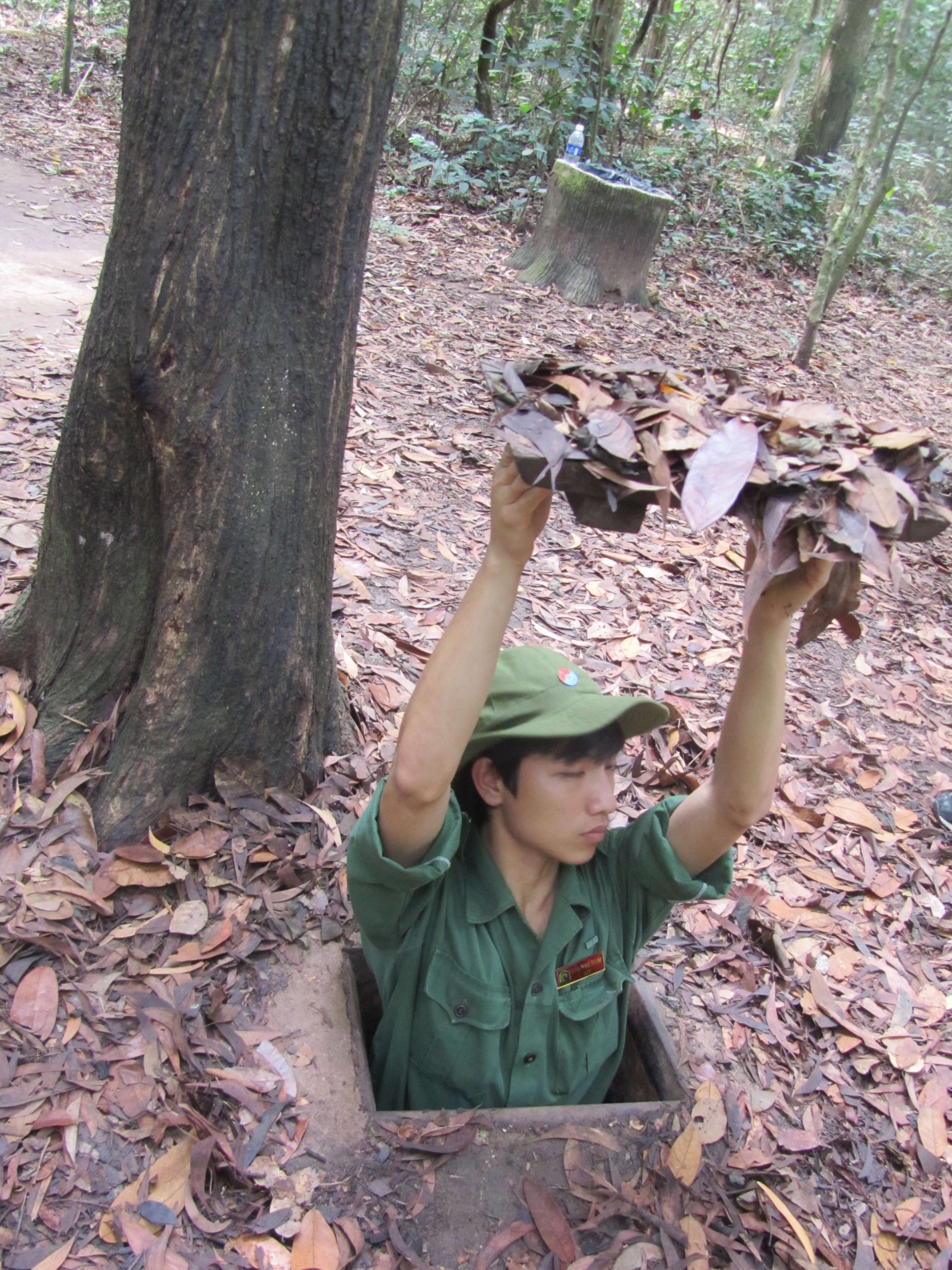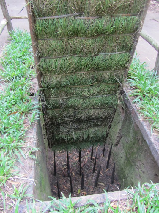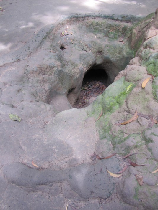 We toured the Cu Chi tunnels, which are an underground system of tunnels that is extremely complex and were constructed by the Vietnamese fighters.  By day the people worked on rubber plantations and other jobs in the city of Cu Chi, but at night the work carving out the tunnels went on unnoticed.  This underground system of tunnels has three floors, and looks like an ant colony has constructed it.  The Vietnamese soldiers had living quarters, cooking quarters, meeting spaces, and special secret entrances, plus hand constructed bamboo traps and other traps so that anyone looking for the tunnels, or innocently stepping in the wrong place would be stopped before they reached any knowledge of the tunnels. This tunnel system was also known as the Ho Chi Minh Trail and reached out to the Saigon River, which gave the Viet Cong easy access.  Below you will see photos of the secret entrances that were so small that American’s may not have been able to enter. Also this complex system had ventilation holes. The Vietnamese are proud to show you their accomplishment in their fight for independence.