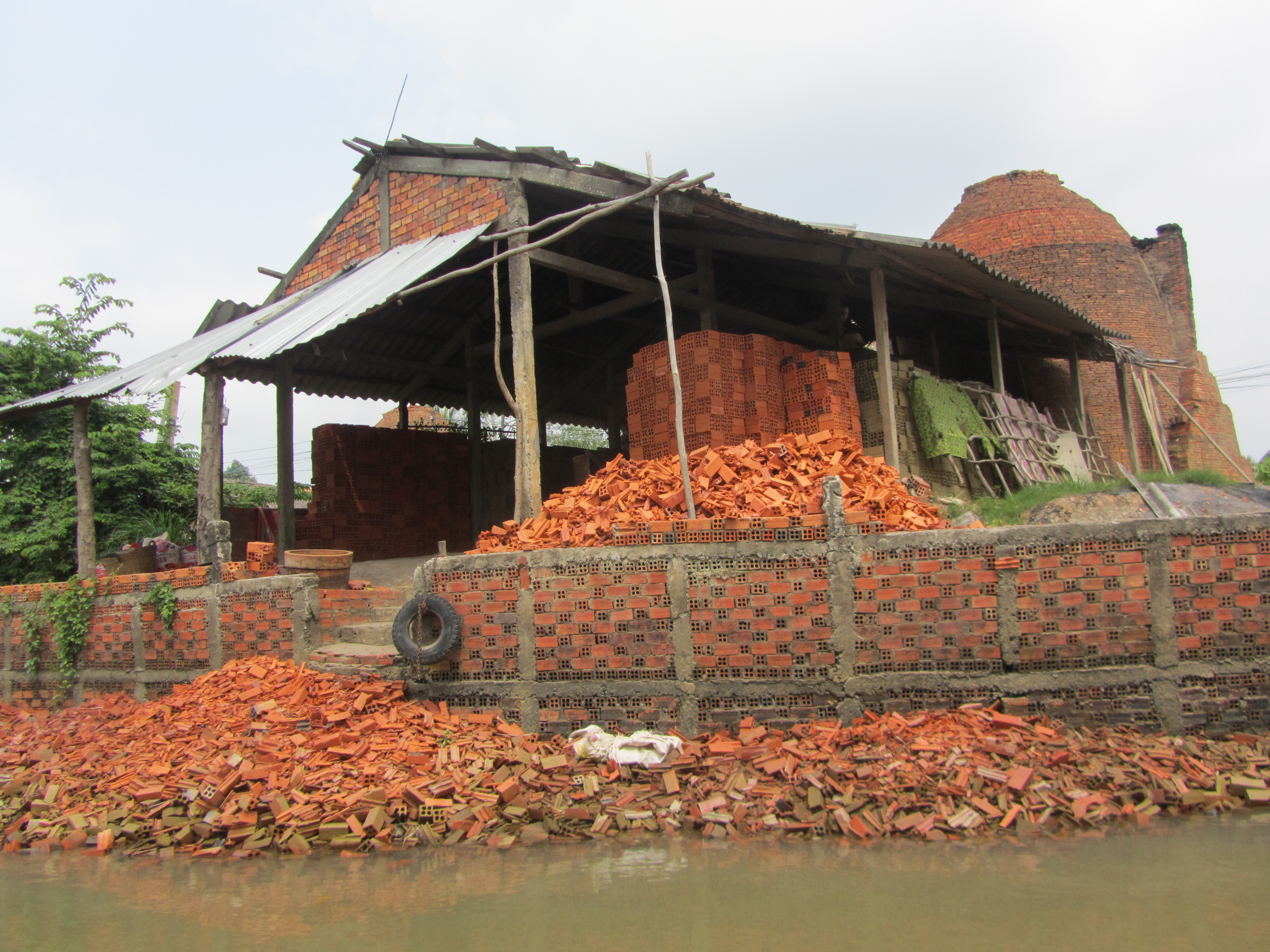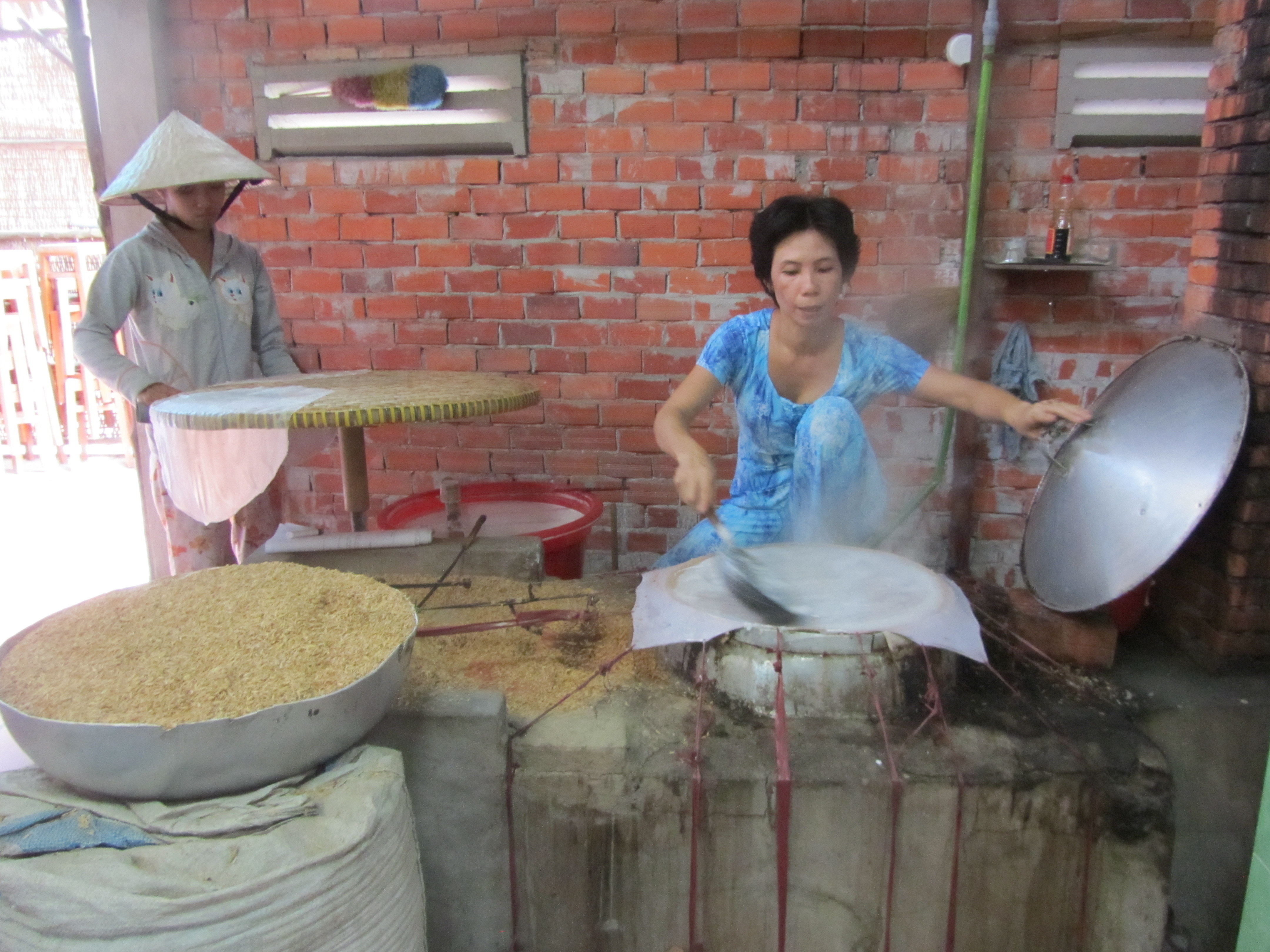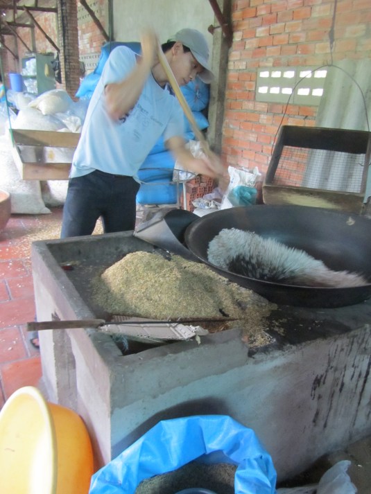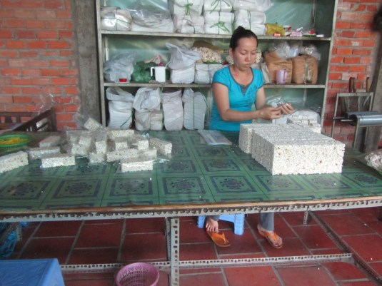 As we floated along witnessing the sights and sounds of Mekong rural life and Mekong River sights, we stopped to observe rice paper making, coconut candy making and popped rice products. We taste tested everything. We continued on to view traditional brick and tile factors and saw how locals are using palm leaves for houses.