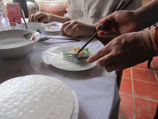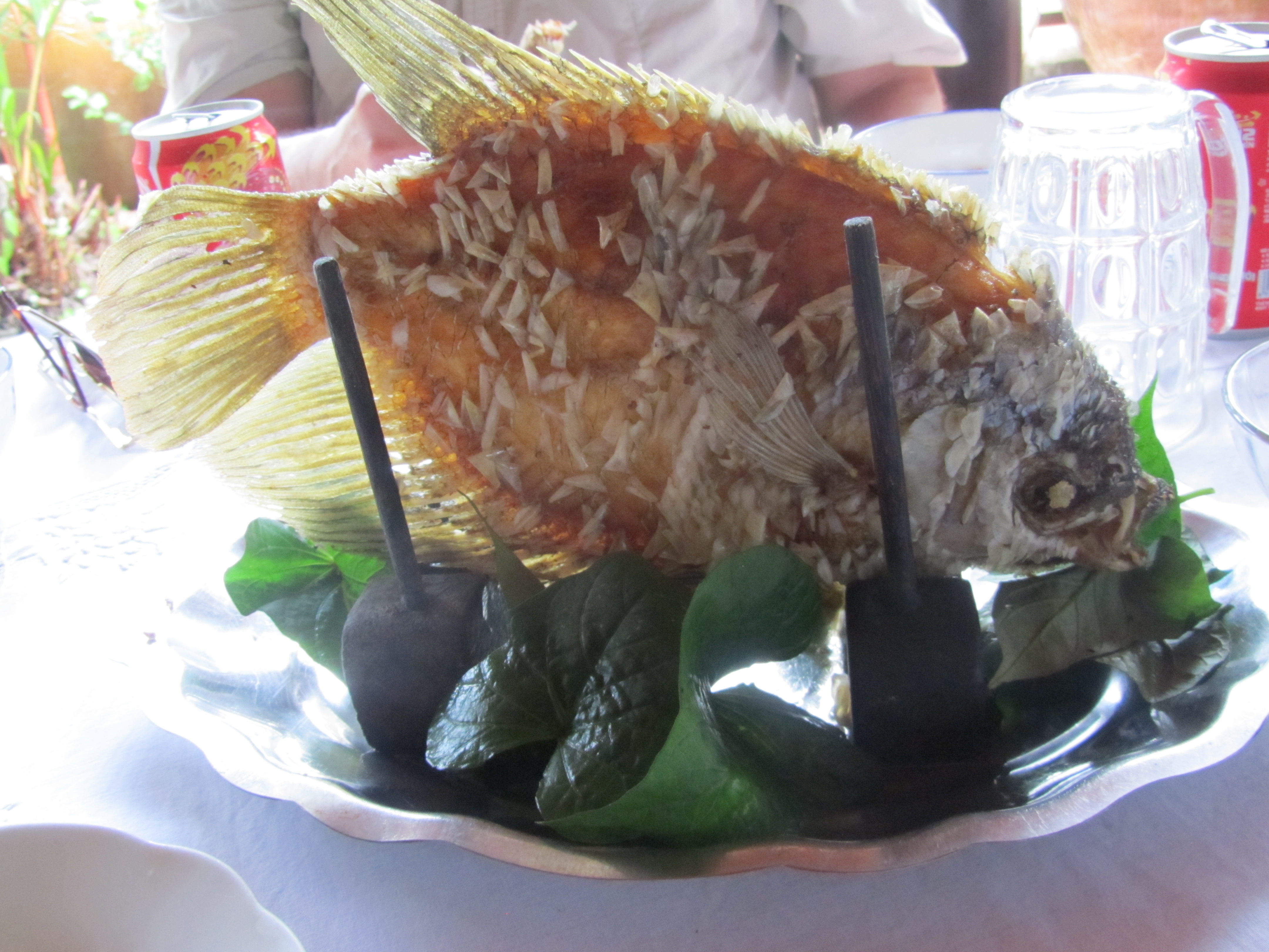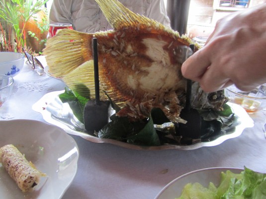 A lovely luncheon awaited us at a special Indochinese restaurant. Sorry, in the photo, I cut off the fin of our Elephant Ear Fish, which was plucked and wrapped with fresh greens and condiments into a rice paper roll.