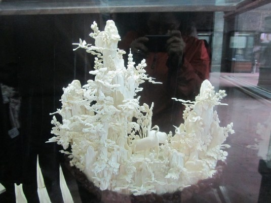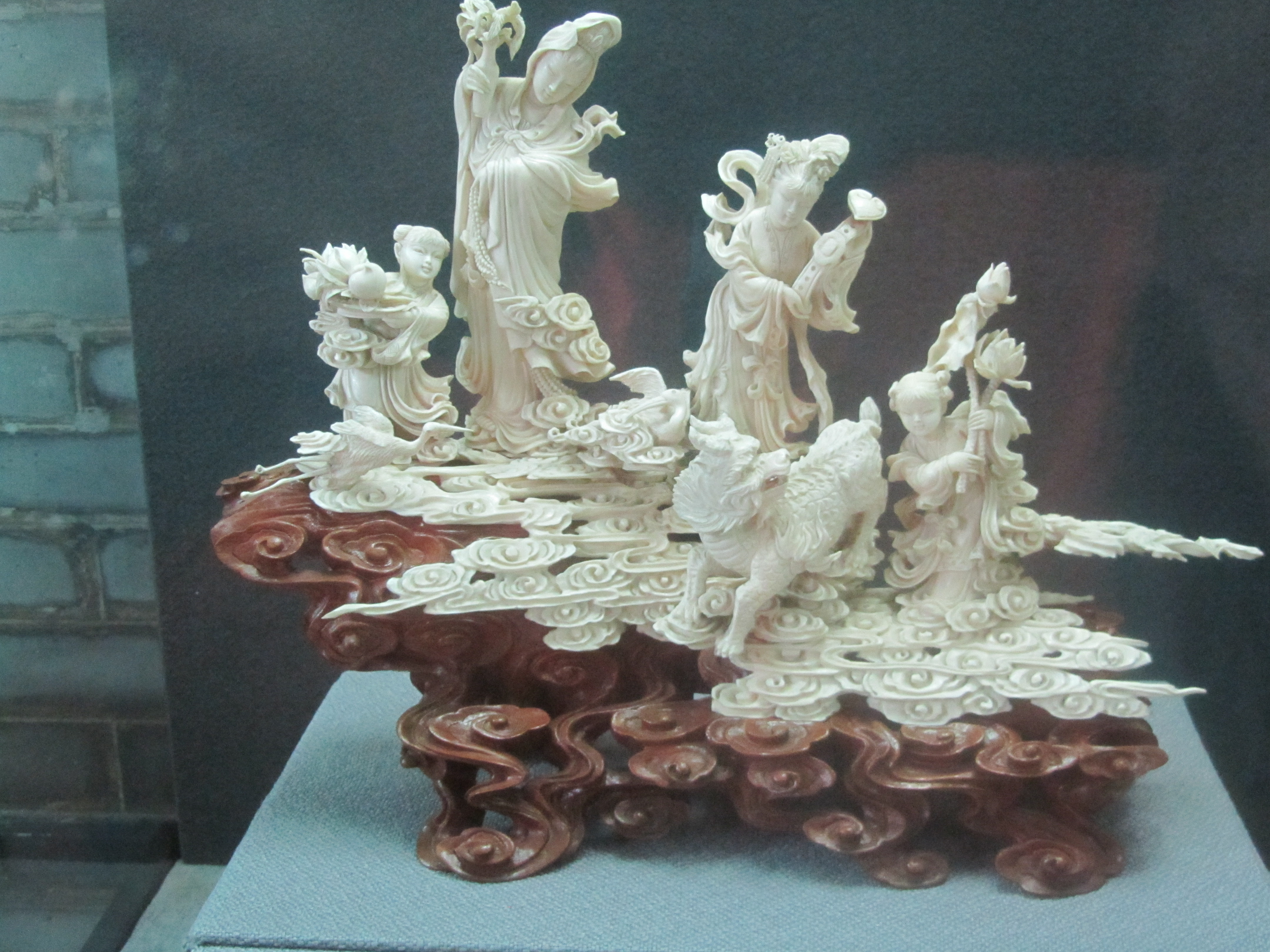 The carved balls are a piece to insure future generations. I bought one for our family, but not out of ivory, out of sandalwood. Have you ever had the sensual pleasure of smelling freshly carved sandalwood? It is hypnotic. I put the balls in my jacket pocket and by the end of the afternoon, I was in a mellow, comfortable state of mind. I think I am a little allergic to long-term association with freshly carved sandalwood because my nose got stuffy and started to run. After distancing from the smell the nose cleared up. Still, the smell is just a great treat.