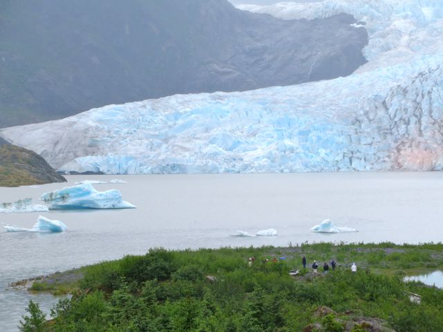 Clad in our warmest layers and rain gear, we are let out to trudge to the Glacier and further if you wanted to hike to the waterfalls. I am shocked to see the area in which Skip and I climbed all over the Mendenhall Glacier so many years ago is now water and you have to view the glacier from a cemented area or a lookout building they have built as a viewing structure. We viewed a film in the center that explained that our climbing part of the glacier had simply melted and has shrunk dramatically. They say you can never go back, and if you back to the exact same spot, the change may be dramatic. Sometimes memories work out well.