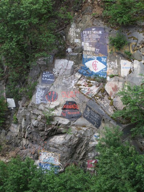 When we arrived in Skagway and were finally docked, we opened our curtains to a wall of painted rocks. They are charming, but only later did we learned the beginning history of these painted rocks. They were used as a suitable mail gathering system and now they have become dock art. Names of people and businesses were painted on the rocks with a curved spike in the middle. The mail ships would come along the sides of the rocks, dutifully hanging mail on these rocks to be retrieved by the owners at some point that day. Outgoing mail was hung on the spikes and picked up a day later.