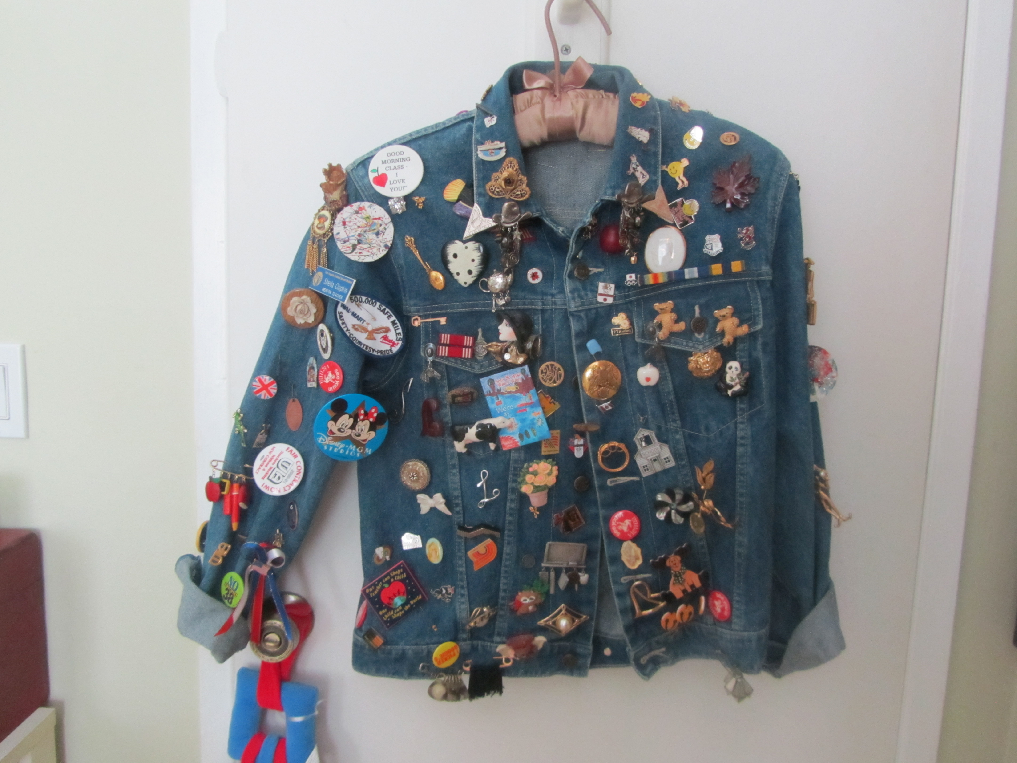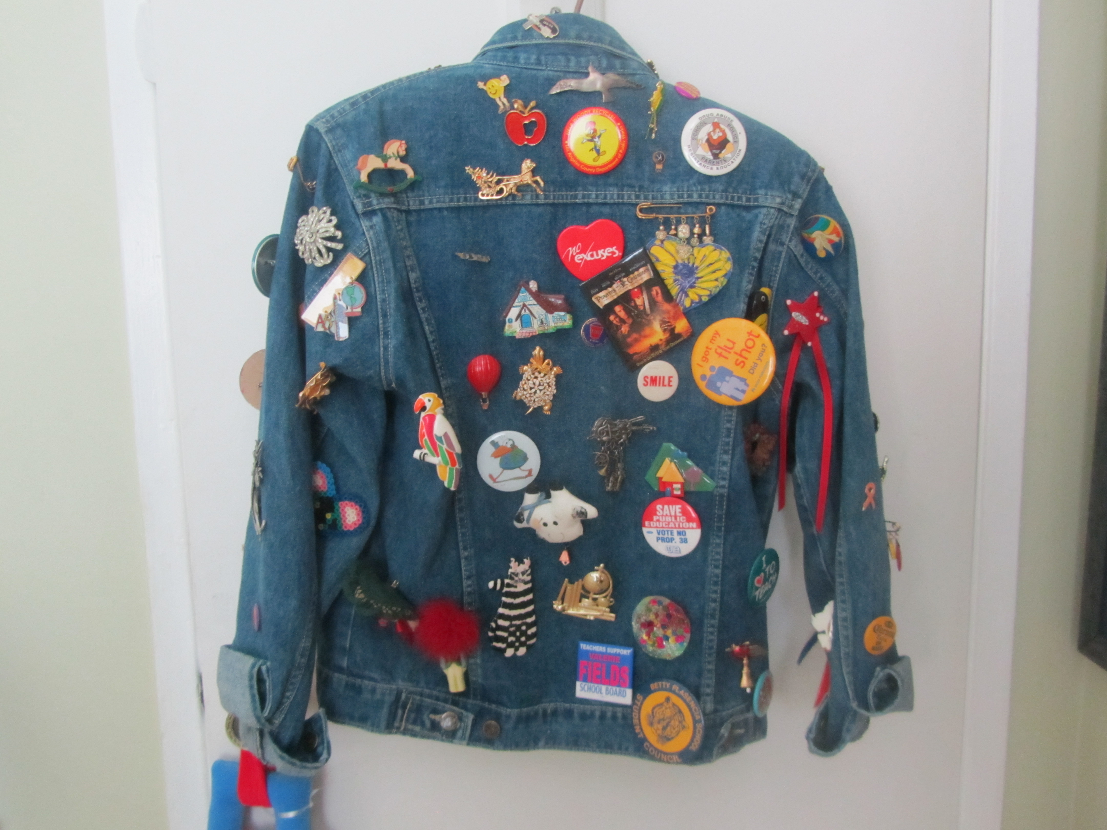 The jacket you see before you holds bits and pieces of my life. Remember, it’s my birthday and I get the top billing. One gold and white porcelain pin has my first initial painted on it in 24K gold. What a big deal when I was presented with this pin.