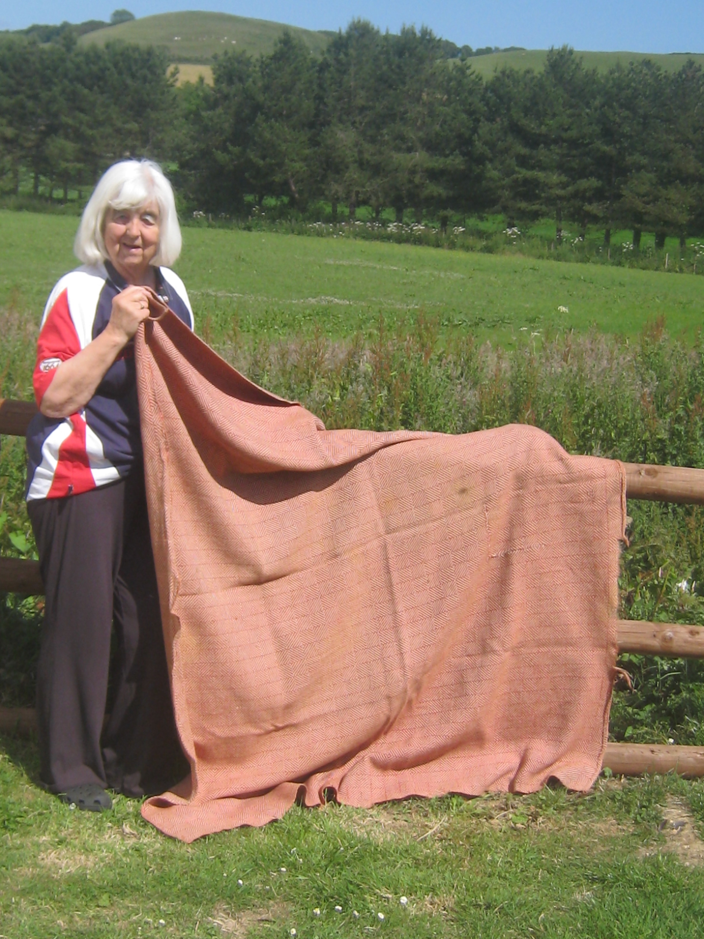 This may be an item for your blog as requested. This is a woven square of wool which belonged to Marlyn’s grandmother. This would make it well over 100 years old. Marlyn’s grandmother came from Perthshire in the East of Scotland. The nearest big city was Dundee which was a town famous for weaving jute into sacks. Thus there was a tradition of weaving and this rug may well have been hand woven. It is a very simple pattern and has mostly been used by us as a picnic blanket. It does have a hole which I made when I slammed the door of the trunk down on it whilst it was in the car. M carefully sewed it up. J.